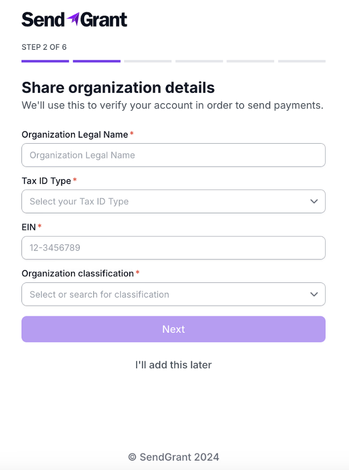Note: If unable to complete the information at any step, select "I'll add this later" to proceed to the dashboard.You can return to complete the onboarding steps later.