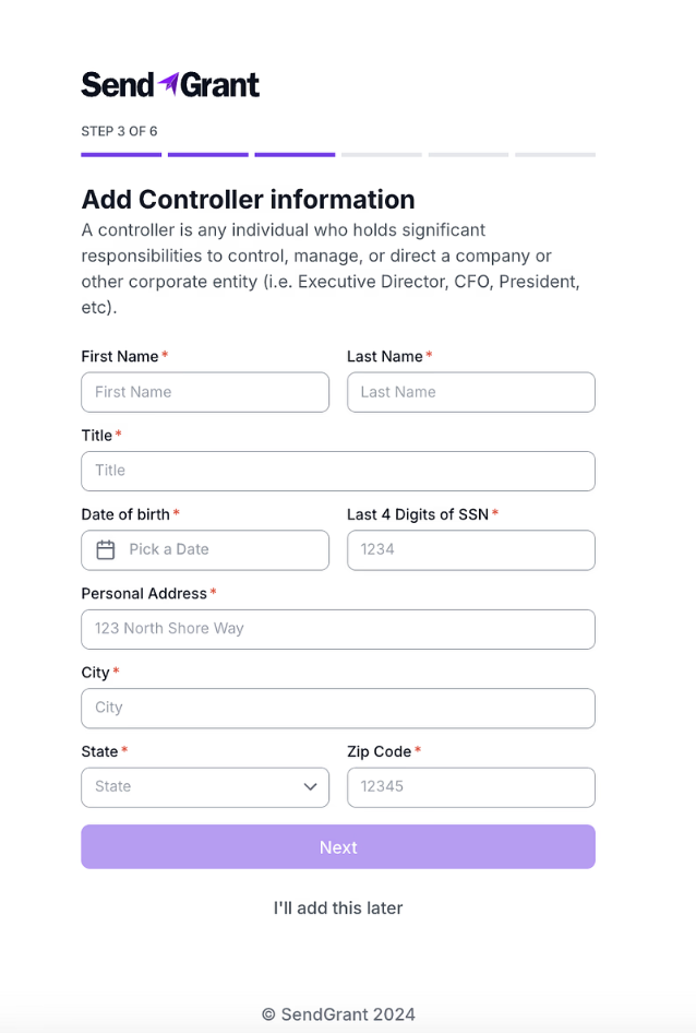 A controller is any individual who holds significant responsibilities to control, manage, or direct an organization or other corporate entity (i.e. Executive Director, CFO, President, etc)Note: To complete this step, it's important to note that the controller's personal address, which is often different from the organization's address previously provided, must be submitted. Our payment processor, Dwolla, conducts a verification process in compliance with Know Your Customer (KYC) regulations for all customers. This process uses both the organization's and controller's information to verify the account through their system and public records. In cases where the controller or business has a limited public footprint, additional documentation may be required.- Click the "Next" button to proceed.