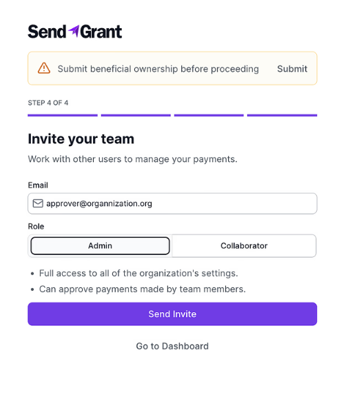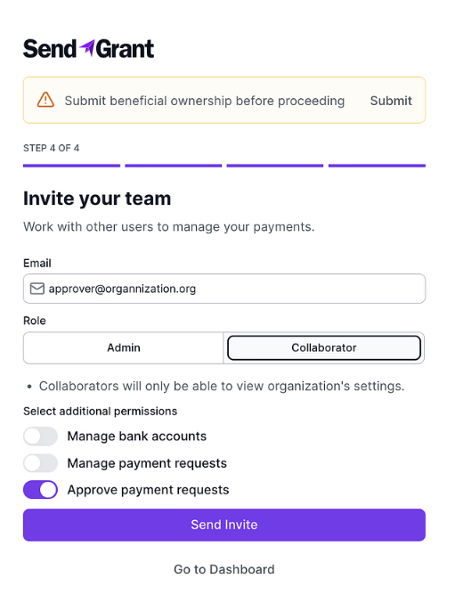 - Enter the email address of the payment approver, select the role (Admin or Collaborator), and click "Send Invite."