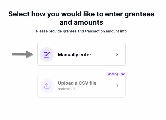 - Decide how you want to enter Grantees and amounts: manually or by uploading a CSV file.