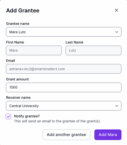 - Pick Grantees from your existing list or add new Grantees by providing their name, email, and mobile phone number.