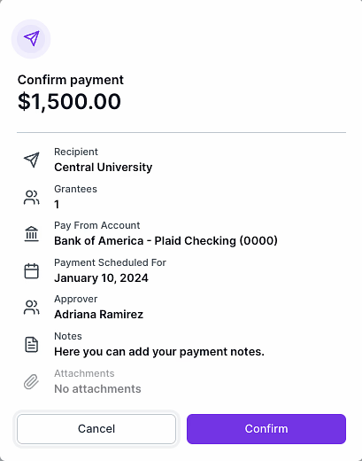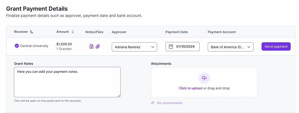 - Add Notes and Files: Attach additional information or documents related to the payment, enhancing transparency and record-keeping. (e.g., grantee info, fund allocation details).
